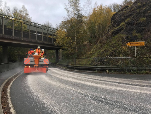 Am Mittwochmorgen musste die Feuerwehr Menden im Hönnetal und auf der eingerichteten Umleitungstrecke eine Kraftstoffspur beseitigen. Diese zog sich über die Hönnetalstraße bis in den Ortsteil Asbeck und weiter Richtung Balve. Dort befand sich ebenfalls die örtliche Feuerwehr im Einsatz. Über eine Streuanlage an einem LKW der Feuerwehr und teilweise von Hand, streuten die Mendener Einsatzkräfte die mehrere Kilometer lange Kraftstoffspur ab. Um den Verkehr vor der Gefahrenstelle zu warnen wurden entsprechende Schilder aufgestellt. Etwa 20 Einsatzkräfte der Feuerwache Menden und der Löschgruppen Lendringsen der Freiwilligen Feuerwehr befanden sich für eine Stunde im Einsatz.