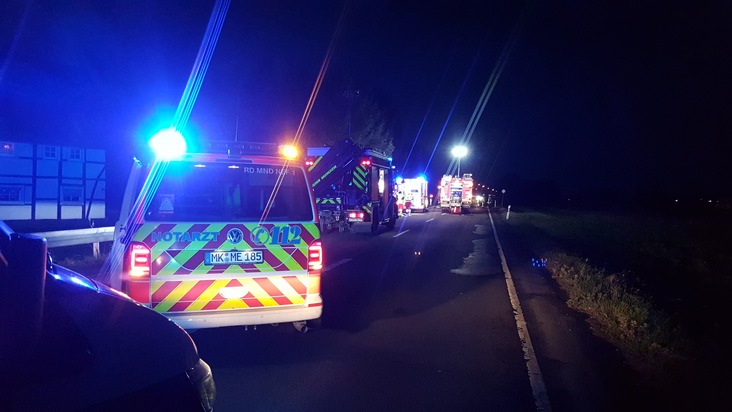 Die Provinzialstraße zwischen Bösperde und Halingen musste für knapp eine Stunde voll gesperrt werden, Feuerwehr und Rettungsdienst Menden waren mit rund 30 Einsatzkräften vor Ort.
