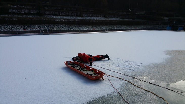 Die Kameraden der hauptamtlichen Wache nutzten am heutigen Donnerstag die Gelegenheit und übten die Eisrettung im Bürgerbad Leitmecke.