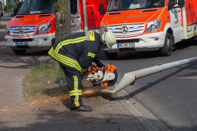 Neben der Personenrettung wurde außerdem der Brandschutz sichergestellt und die umgestürzte Laterne mittels Motortrennschleifer entfernt.