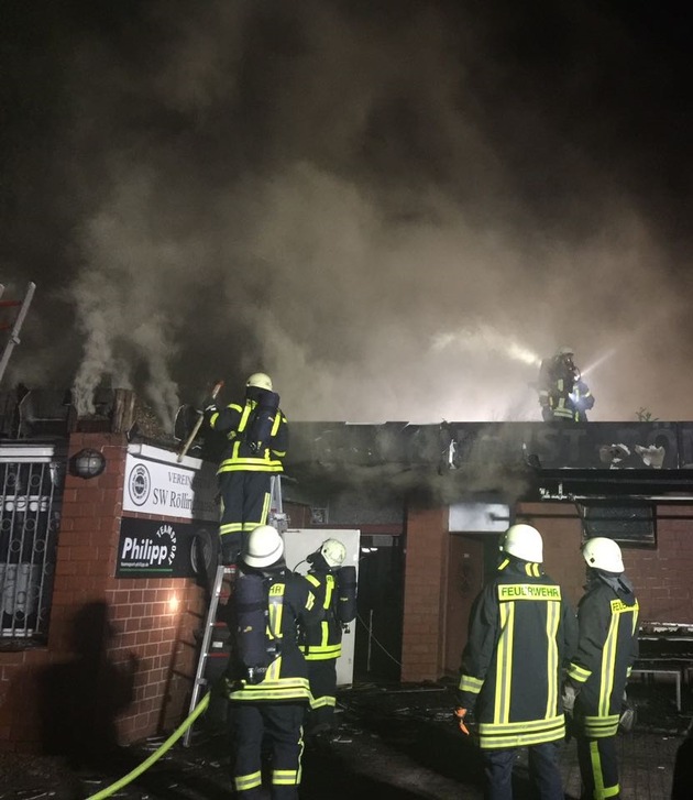 Beim Eintreffen der ersten Einsatzkräfte an der Einsatzstelle brannte diverses Mobiliar im Außenbereich des Vereinsheims des dort ansässigen Sportvereins "SW Röllinghausen" auf einer Fläche von circa zehn Quadratmetern. Der Brand hatte bereits vor dem Eintreffen der Einsatzkräfte auf die zum Teil hölzerne Zwischendecke übergegriffen. Aufgrund der guten Sicherung aller Zugangsmöglichkeiten in das Gebäude mussten sich die Einsatzkräfte vor Beginn einer effektiven Brandbekämpfung mittels schwerem hydraulischen Gerät Zutritt verschaffen.