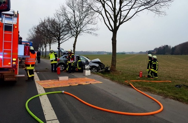 An der Einsatzstelle war der Fahrzeuginsasse nicht eingeklemmt, aber schwer verletzt. Das Fahrzeug war aus unklarer Ursache frontal mit einem Straßenbaum kollidiert. Vier Mitarbeiter der Feuerwehr Recklinghausen, welche sich zum Unfallzeitpunkt auf dem Weg zur Notfallsanitäter-Weiterbildung befanden, fungierten als Ersthelfer. Parallel wurde aufgrund der unklaren Unfallmeldung die Feuerwehr Marl alarmiert, welche aber nicht mehr tätig werden musste.