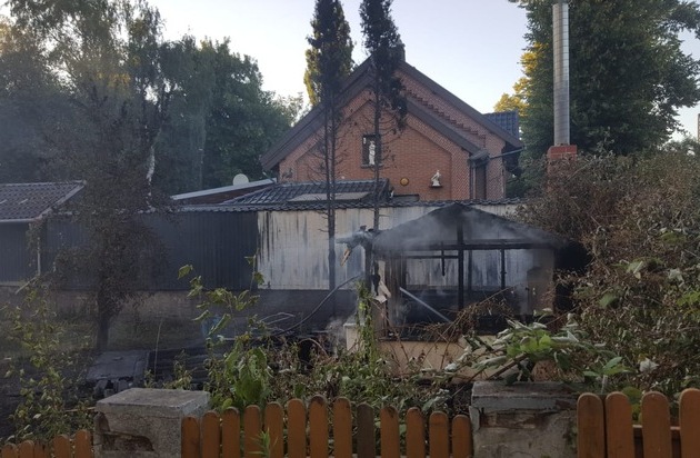 An der Brandstelle "Gartenlaube" konnte eine Ausbreitung der Flammen auf eine benachbarte Garage mitsamt Dieseltank sowie das benachbarte, bewohnte Wohnhaus verhindert werden. Einer der Bewohner hatte noch vor dem Eintreffen der Einsatzkräfte eigene Löschversuche unternommen sowie diverse Gasflaschen aus der Garage geholt. Er wurde im Anschluss rettungsdienstlich untersucht, bedurfte aber keiner weiteren Behandlung. Im Anschluss an die Löschmaßnahmen an dieser Brandstelle wurde die Gartenlaube und die benachbarte Lagerstätte für Brennholz auf Glutnester untersucht und kontrolliert. Das Wohnhaus wurde mittels Hochleistungslüfter der Feuerwehr von Rauchgasen befreit und danach freigemessen. Die Bewohner konnten hiernach wieder in das Wohnhaus zurückkehren.