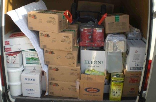 Schon bei der ersten technischen Begutachtung des Transporters fielen den Ordnungshütern abgefahrene Reifen und eine gerissene Windschutzscheibe auf. Darüber hinaus war das Fahrzeug rund 40 % überladen. Die Antwort hierfür entdeckten die Autobahnpolizisten beim Blick auf die Ladefläche: ungekühlte Lebensmittel und Tiefkühlwaren, darunter Pommes Frites, Geflügel-, Lamm- und Schweinefleisch, Milchprodukte sowie typisch griechische Spezialitäten.