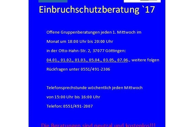 Die nächste offene Einbruchschutzberatung (siehe Terminübersicht im Anhang) findet außerdem am Mittwoch, dem 4. Januar 2017, 18.00 bis 20.00 Uhr, im Dienstgebäude der PI Göttingen, Otto-Hahn-Straße 2, 37077 Göttingen statt. Anmeldungen zur Teilnahme nimmt das Präventionsteam unter Telefon 0551/491-2306 entgegen.