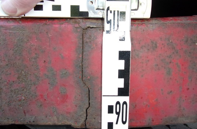 Bei der ersten Begutachtung des Sattelzuges entdeckten die Autobahnpolizisten am Auflieger insgesamt zehn Risse im Bereich des tragenden Rahmens (siehe Foto). Dem Brummifahrer wurde deshalb sofort die Weiterfahrt untersagt.