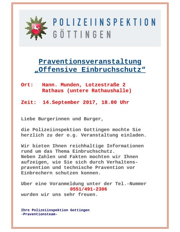 HANN.MÜNDEN (jan) - Am Donnertag, 14. September Juni 2017 findet, um 18.00 Uhr, eine kostenlose Einbruchschutz-Präventionsveranstaltung der Polizeiinspektion Göttingen im Rathaus Hann.Münden (untere Rathaushalle), Lotzestraße 2, statt.