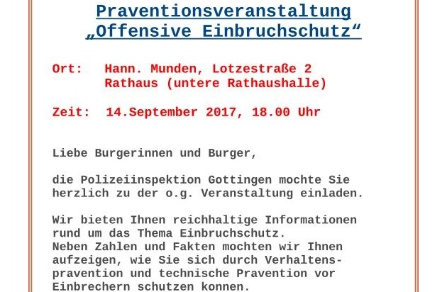 POL-GÖ: (530/2017) "Beratungsoffensive für wirksamen Einbruchschutz" am 14. September 2017 in Hann.Münden -Einbruchschutzexperte der Polizei Göttingen gibt kostenlose Tipps, Anmeldung erbeten