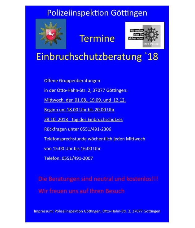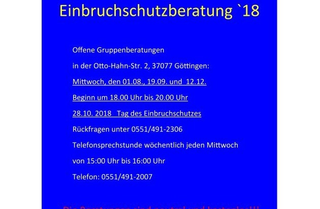 Mit einer speziellen Telefonberatung bietet die Polizeiinspektion Göttingen Interessierten außerdem einen weiteren Service an. Jeden Mittwoch in der Zeit von 15.00 bis 16.00 Uhr steht ein Experte der Polizei unter Telefon 0551/491-2007 für alle Fragen zum Thema "Einbruchschutz" zur Verfügung.