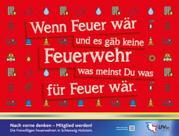 Da der Verband seit diesem Jahr vom Land mit Zuwendungen aus den Lottoerlösen speziell für Maßnahmen der Öffentlichkeitsarbeit bedacht wird, sind weitere Aktionen möglich, um die leichte Aufwärtskurve weiter ansteigen zu lassen. Im Mittelpunkt stand bei der Versammlung daher auch die Vorstellung eines neuen Kampagnenmotives. Unkonventionell, mit Augen-zwinkern, aber durchaus auch zum Nachdenken anregend ist der Spruch "Wenn Feuer wär und es gäb keine Feuerwehr- was meinst du was für Feuer wär" heißt es da auf rotem Grund mit verspielten Icons. Das Motiv soll nun landesweit in allen möglichen Formen eingesetzt werden. Vom T-Shirt über Kaffeebecher bis hin zu Bauzaunplanen und landesweiter Groß-flächenplakatwerbung wird das Motiv Verwendung finden. Daneben plant der Verband seine Beteiligung bei zahlreichen Großveranstaltungen wie der NORLA oder der "Sommertour" des NDR. Wie im Vorjahr appellierte der Landesbrandmeister aber auch wieder an jeden Bürgermeister im Lande, dass das Thema Mitgliederwerbung Chefsache bleibt. Denn neben den begleiten-den Maßnahmen des Dachverbandes seien individuelle Ansprachen vor Ort gepaart mit re-gionalen Aktionen der Schlüssel zum Erfolg.