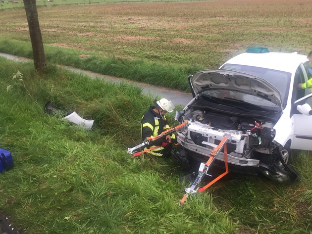 Samstag, 12. August 2017, 17:48 Uhr, Lügder Straße. Der Löschzug Rischenau sowie der Löschzug Lügde wurden mit dem Einsatzstichwort "Verkehrsunfall / eingeklemmte Person" auf die Lügder Straße zwischen Rischenau und Elbrinxen alarmiert. An der Einsatzstelle stellte sich heraus, dass im Kurvenbereich, aus ungeklärter Ursache, zwei PKWs zusammen gestoßen waren. Eine Person war im PKW eingeschlossen und wurde von den Einsatzkräften aus dem PKW befreit. Der PKW im Straßengraben wurde gegen ein eventuelles Abrutschen gesichert. Weitere Maßnahmen der Einsatzkräfte vor Ort waren die Sicherung der Unfallstelle gegen den fließenden Verkehr sowie die Sicherstellung des Brandschutzes an den verunfallten Fahrzeugen. Nach der Bergung der Fahrzeuge wurde zusätzlich die Fahrbahn von Schmutz und ausgelaufenen Betriebsstoffen gereinigt. Neben der Feuerwehr Lügde waren die Polizei, der Rettungsdienst mit drei RTWs, der Notarzt sowie der Rettungshubschrauber Christoph 7 aus Kassel im Einsatz. Um 19:45 Uhr war der Einsatz für die Feuerwehr beendet.
