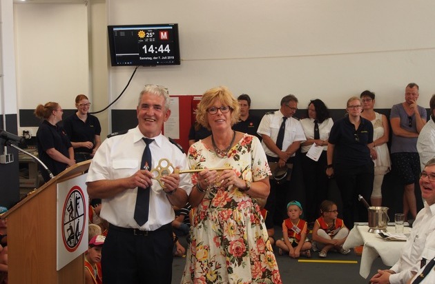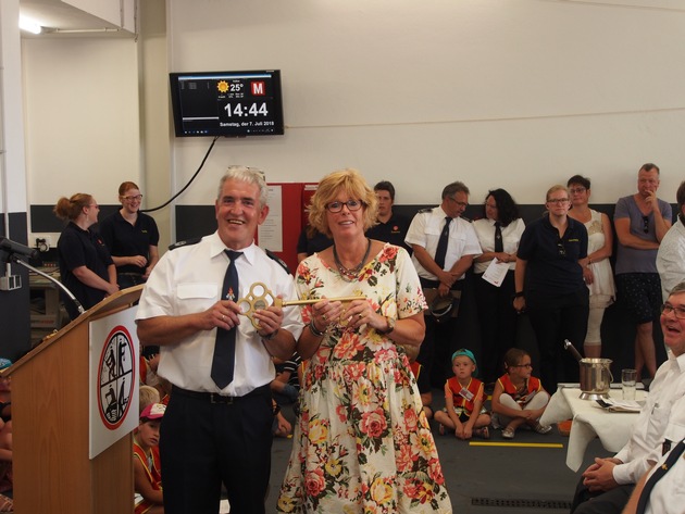 Georg Bouwmann, Leiter der Feuerwehr Kalkar, eröffnete am 07.07.2018 den Tag der offenen Tür der Freiwilligen Feuerwehr Appeldorn. Gekommen waren neben Persönlichkeiten der Feuerwehr und Politik auch viele Angehörige, Anwohner und Neugierige. Denn der Neubau wurde zwar schlüsselfertig gebaut, beteiligt waren aber so viele, dass alleine der Dank mehrere Minuten in Anspruch nahm. "Das neue Gerätehaus sei nicht nur zweckmäßig, sondern auch noch schön", so beschrieb Bürgermeisterin Fr. Dr. Schulz zutreffend das neue Domizil der Freiwilligen Feuerwehr Appeldorn. Löschgruppenführer und stellvertretender Stadtbrandinspektor Roland Matenaer führte aus: "das 2.500 Quadratmeter große Gelände steht nicht nur den 33 Appeldorner Kameradinnen und Kameraden zur Verfügung, sondern auch den 25 Löschzwergen der Kinderfeuerwehr." Und diese freuten sich neben der offiziellen Einweihung des Gerätehauses auch über die Einsegnung ihres neuen Kinderfeuerwehrfahrzeuges, einem Mannschaftstransportwagen- MTF. Beeindruckt und vor allem schmunzelnd mussten viele Besucher feststellen, dass die hinteren sechs Plätze mit Kindersitzen ausgestattet sind. Das hatten auch noch nicht viele gesehen. Und obwohl so viele Zuhörer da waren, wurde es auf einmal ganz still. Daniel ist im Mai mit seinem Auto verunglückt. Er wurde durch die die Löschgruppe Appeldorn und den Löschzug Kalkar Mitte aus diesem gerettet. Mit Gehhilfen und belegter Stimme bedankte er sich bei den Kameraden. Er selber hat keine Erinnerung mehr an das Geschehen. "Danke das ihr mich zu meiner Familie gebracht habt", diesen Satz sprach er immer wieder aus. Ein langer Genesungsweg liegt bereits hinter ihm und noch ist nicht alles geschafft. Und dann, so überlegt er, wird er vielleicht auch ein Teil der Feuerwehr- Familie. Diese eindrucksvollen Worte rundeten den offiziellen Teil ab und man verlagerte sich auf die Feier. Gegrilltes und kühle Getränke wurden in einer tollen Atmosphäre genossen. Auf den zugehörigen 20 Parkplätzen waren Spielstände, Eis und auch Feuerwehr- Experimente für die kleinen Besucher angerichtet. Die Jugendfeuerwehr stellte eine Angriffs - Übung dar und die Appeldorn Garde führte extra einen Show - Tanz auf. Besichtigt wurde sehr ausdehnt, von den Toiletten mit Behinderten WC, der Werkstatt, der Trocknungsanlage und dem Schulungsraum über das Materiallager und die Teeküche so ziemlich alles. Genauestens unter die Lupe genommen und kritisch beäugt erhielten die Kameradinnen und Kameraden ein großes Kompliment für ihr neues Gerätehaus. Die vielen Glückwünsche und die Anerkennungen auf verschiedensten Wegen verdeutlichen das was die Kameradinnen und Kameraden der Freiwilligen Feuerwehr in Kalkar machen: Sie retten, löschen, bergen und schützen. Das Hab und Gut anderer. Unentgeltlich. Als große Familie und in Appeldorn nun in einem neuen "Haus".