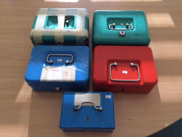 Am 27.03.2016, gegen 09:40 Uhr, werden auf dem Parkplatz des FC Herdecke-Ende am Kirchender Dorfweg insgesamt fünf unverschlossene Geldkassetten ohne Inhalt aufgefunden. Auf drei Kassetten sind Aufkleber mit den Nummern 2,3 und 6 aufgebracht. Zudem befindet sich auf einer Kassette ein Etikett mit der Aufschrift "Kasse Ergebnisliste" und auf einer weiteren ein Etikett welches mit "Kasse 3" beschriftet ist. Bislang können die Geldkassetten nicht zugeordnet werden. Eine entsprechende Strafanzeige ist bei der Polizei noch nicht erstattet worden. Wer kann Hinweise zur Herkunft der abgebildeten Kassetten machen? Die Polizei bittet um Hinweise unter der Rufnummer 02335/9166-7000.