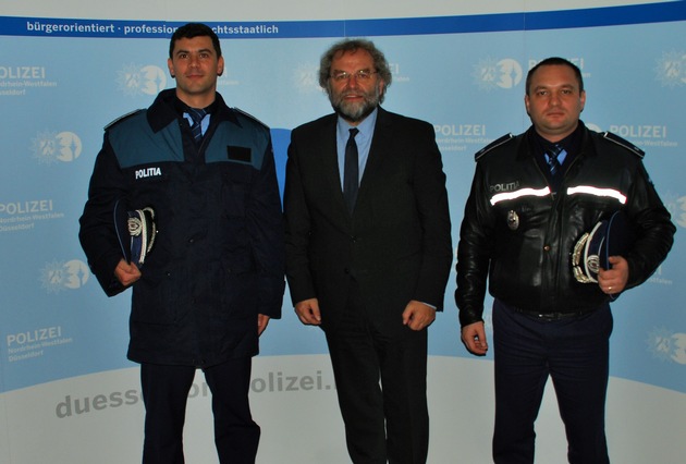 Polizeipräsident Norbert Wesseler begrüßte heute Nachmittag zwei Polizeibeamte aus Rumänien, die für mehrere Tage ihre Düsseldorfer Kollegen unterstützen werden. Möglich wird dieser Einsatz durch ein Abkommen zwischen EU-Staaten aus dem Jahr 2005.