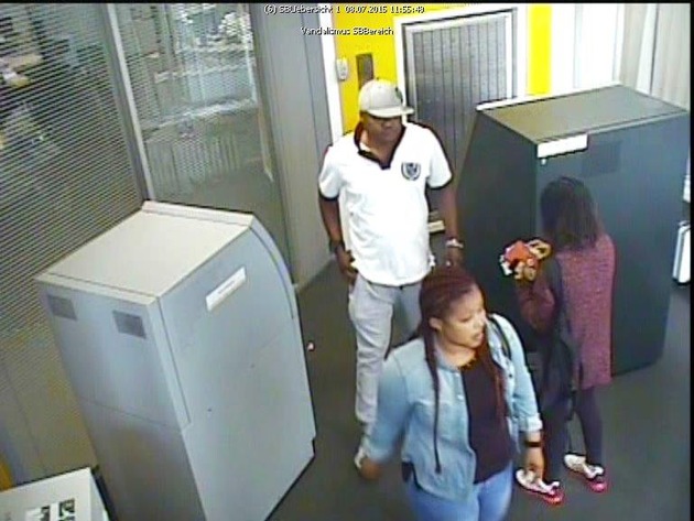 Die beiden dunkelhäutigen männlichen und weiblichen Täter können wie folgt beschrieben werden: Der Mann ist circa 40 Jahre alt. Er hatte keinen Bart und keine Brille. Bekleidet war er mit einem weißen T-Shirt mit Aufdruck auf der linken Brust, heller Stoffhose und einem grauen Basecap.