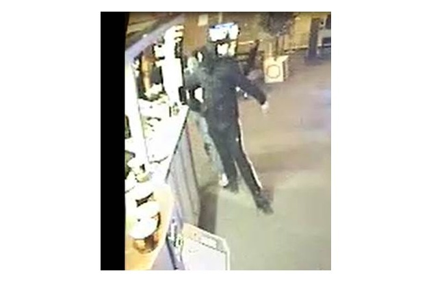 Bild 3: rechts im Bild ein stämmiger Täter mit einer Schusswaffe in der Hand, links ein schlanker Täter mit einer auffälligen College-Jacke (dunkel mit hellen Ärmeln)