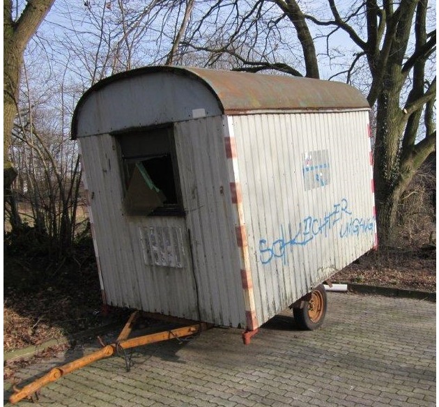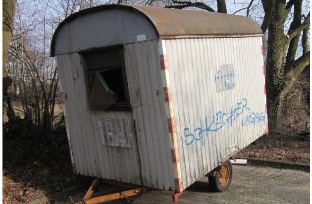 Wer kann Hinweise zu dem hier abgebildeten Bauwagen geben? Wer weiß etwas über die Herkunft der Kanister mit den Flüssigkeiten? Hinweise bitte an die Tel. 04101-202-0.