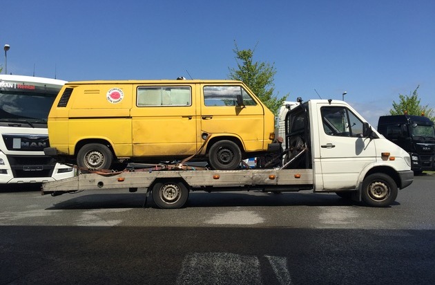 Gestern Mittag kontrollierten Beamte vom Polizei-Autobahn-und Bezirksrevier Pinneberg, Fachdienst Autobahn, einen überladenen Lkw mit unzureichender Ladungssicherung. Bei der Kontrolle wurden diverse technische Mängel festgestellt. Der Lkw zeigte Ölverlust am Motorblock; der Unterboden, die Radläufe sowie tragende Karosserieteile und Rahmen waren stark verrostet. Die Ladung, ein VW T3, war durch verschlissene Spanngurte und Befestigung der Spanngurte an der Ladung unzureichend und falsch gesichert. Der Lkw wurde zur Erstellung eines technischen Gutachtens sichergestellt. Ein Kfz-Sachverständiger stellte eine Vielzahl von Mängeln fest, so dass das Fahrzeug als verkehrsunsicher eingestuft wurde. Eine Wägung ergab zudem, dass der Lkw auf der zweiten Achse um 62 Prozent und bezogen auf das tatsächliche Gesamtgewicht um 34 Prozent überladen war. Der Lkw wurde nach der Begutachtung wieder ausgehändigt, eine Weiterfahrt aber untersagt.