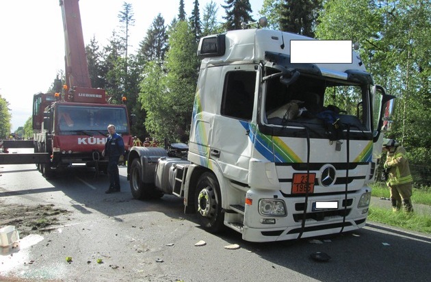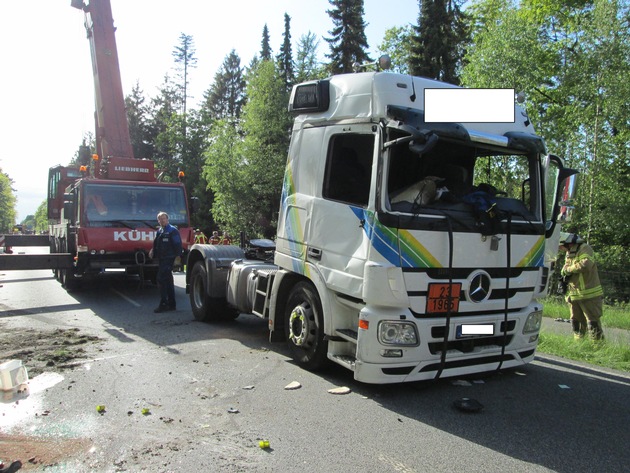Die Sattelzugmaschine riss dabei vom Auflieger ab und blieb mit der Beifahrerseite auf der Straße liegen. Der Auflieger kippte auf die rechte Seite und blieb dann im Graben liegen.