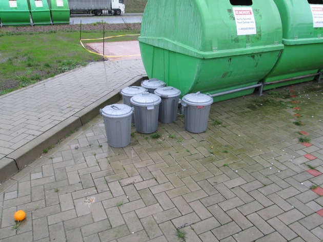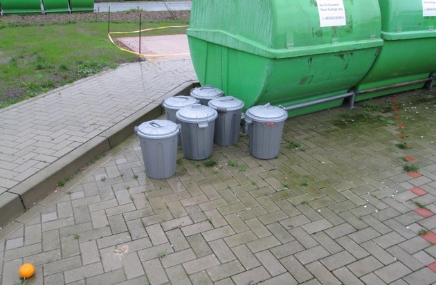 Unbekannte luden insgesamt sechs graue Mülleimer mit verdrecktem Heizöl auf dem Parkplatz an der Autobahn ab und entfernten sich anschließend. Die verständigte Polizei veranlasste die fachgerechte Entsorgung der Tonnen.