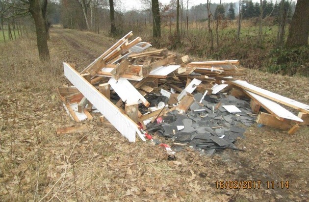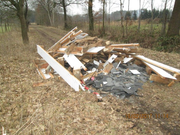 Unbekannte luden in der Nähe des dort befindlichen Hundeplatzes etwa vier Kubikmeter Schindeln aus Schiefer, Reste von alter Mineralwolle, Konstruktionsholz sowie Kunststoffpanelen ab und entfernten sich anschließend.