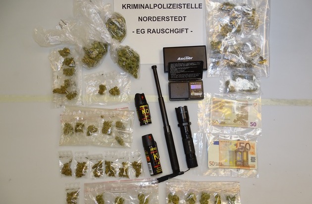 Die Ermittlungsgruppe Rauschgift der Kriminalpolizei Norderstedt hat am Donnerstag, den 18.05.2017, einen mutmaßlichen Rauschgifthändler aus Kaltenkirchen nach einer Wohnungsdurchsuchung vorläufig festgenommen. Der Tatverdacht gegen den 21-Jährigen aus Kaltenkirchen hatte sich im Rahmen noch andauernder Ermittlungen ergeben. Am Morgen des 18.05.2017 setzten die Ermittler aus Norderstedt dann einen zuvor erwirkten Durchsuchungsbeschluss gegen den Beschuldigten an seiner Wohnanschrift in Kaltenkirchen um. In der Wohnung des Verdächtigen beschlagnahmten die Beamten 100 Gramm Cannabiskraut sowie Feinwaagen und diverses szenetypisches Verpackungsmaterial, welches Aufschluss über Art und Umfang seines Betäubungsmittelhandels ergab. Weiterhin fanden sie bei dem Beschuldigten einen Teleskopschlagstock, zwei Reizstoffsprühgeräte und ein Elektroschocker, welcher als Taschenlampe getarnt war und als verbotener Gegenstand nach dem Waffengesetz einzustufen ist. Der Beschuldigte wurde vorläufig festgenommen und zur Kriminalpolizei Norderstedt verbracht. Hier wurde der Beschuldigte am frühen Nachmittag nach Abschluss der kriminalpolizeilichen Sofortmaßnahmen auf Entscheidung der Staatsanwaltschaft Kiel mangels Haftgründen wieder entlassen. Der 21-Jährige muss sich jetzt in einem Strafverfahren wegen unerlaubten Handel mit Betäubungsmitteln in nicht geringer Menge unter Mitführung eines Gegenstandes, der seiner Art nach zur Verletzung von Personen bestimmt ist, verantworten. Für dieses Delikt ist nach dem Betäubungsmittelgesetz eine Freiheitsstrafe von nicht unter fünf Jahren vorgesehen.