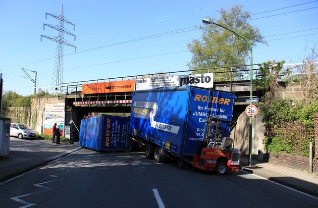 FW-E: LKW mit Anhänger touchiert Eisenbahnbrücke, Fahrer leicht verletzt