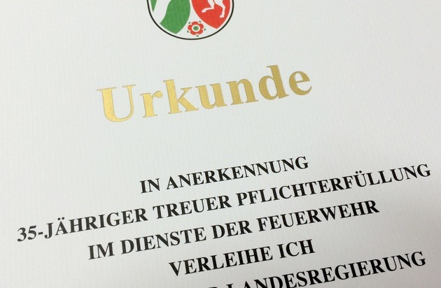 Am Freitag, den 05.02.2016 um 09.30 Uhr verleiht der Beigeordnete Christian Kromberg neun Feuerwehr-Ehrenzeichen. Die Ehrenzeichen sind eine Auszeichnung des Landes NRW. Zur Auszeichnung steht der Einstellungsjahrgang 1981 an, die Mitarbeiter werden mit den Ehrenzeichen in Gold für 35 Jahre Pflichterfüllung geehrt.