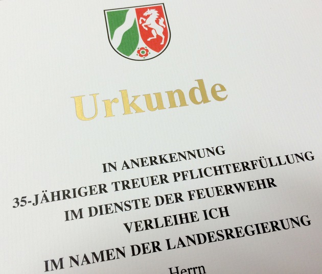 Am Freitag, den 05.02.2016 um 09.30 Uhr verleiht der Beigeordnete Christian Kromberg neun Feuerwehr-Ehrenzeichen. Die Ehrenzeichen sind eine Auszeichnung des Landes NRW. Zur Auszeichnung steht der Einstellungsjahrgang 1981 an, die Mitarbeiter werden mit den Ehrenzeichen in Gold für 35 Jahre Pflichterfüllung geehrt.