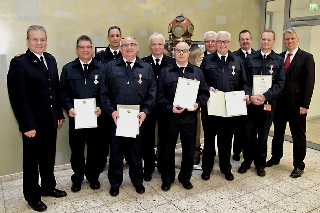 "Welch ein riesiges Erfahrungswissen habe ich heute hier vor mir stehen." Mit diesen Worten begrüßte Essens Feuerwehrdezernent Christian Kromberg neun Kollegen der Feuerwehr Essen, die er heute anlässlich der Verleihung von Feuerwehr-Ehrenzeichen in Gold für jeweils 35 Dienstjahre im Lage- und Logistikzentrum an der Eisernen Hand traf. "Sie haben ihren Dienst aufopferungsvoll und pflichtgemäß, aber auch mit viel Freude erfüllt", so Kromberg weiter. "Das kann man an ihren Gesichtern sehen und an der freudigen Stimmung, die hier im Raum herrscht, fühlen." Deshalb gratulierte er den Jubilaren, auch im Namen des Oberbürgermeisters, sehr herzlich. Die Urkundenübergabe besorgte Kromberg selbst, das Anstecken der Ehrenzeichen überließ er vorsichtshalber dem "Routinier" und Amtsleiter Ulrich Bogdahn, der genau wisse, wo man die Nadel am besten platziere, "weil er die Uniformen viel besser kenne". (MF)