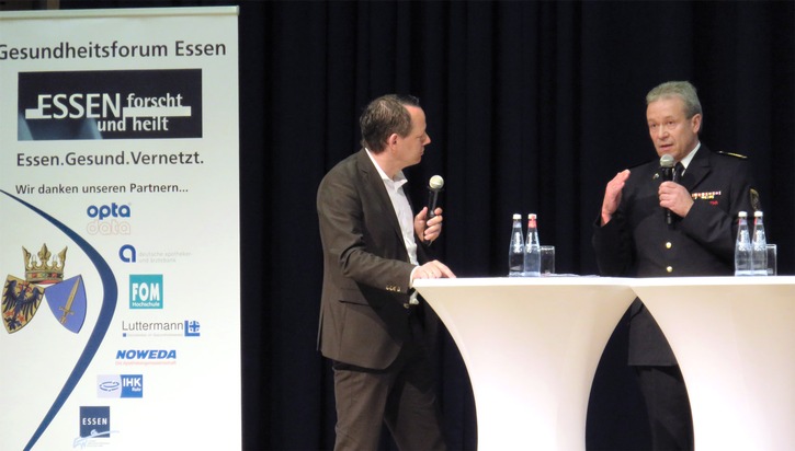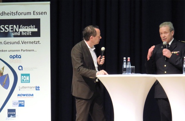 Was passiert eigentlich, bevor Rettungs- oder Notfallsanitäter und Notarzt beim Patienten eintreffen? Wer ist in der Lage, als Ersthelfer lebensrettende Sofortmaßnahmen durchzuführen und so beim lebensbedrohlichen Herz-Kreislaufstillstand sofort und möglichst effektiv zu helfen? Essens Feuerwehrchef Ulrich Bogdahn hat als Antwort auf diese Fragen einen leidenschaftlichen Wunsch: "Erste-Hilfe-Ausbildung muss in die Schulen. Der Lehrplan muss mindestens ab der fünften Klasse entsprechend angepasst werden. So schaffen wir es mittelfristig, Patienten sofort zu versorgen und die wichtigen ersten Minuten zum Beispiel bei einem Herzinfarkt nicht ungenutzt verstreichen zu lassen. Schon bevor ausgebildetes Personal übernehmen kann". Sein Appell an die anwesenden Gäste des 1. Essener Gesundheitsforums in der Messe Essen, zu dem Oberbürgermeister Thomas Kufen geladen hatte, ist deutlich: "Helfen Sie alle mit, dieses Thema in die Köpfe der verantwortlichen Menschen in den Gesundheitssystemen und der Landesregierung zu transportieren." Der spontane Applaus aus dem Auditorium sprach für sich. (MF)