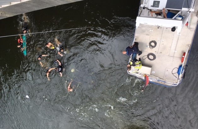 Heute Mittag (16. Mai) gegen 13.45 Uhr ereignete sich ein folgenschwerer Verkehrsunfall in Essen-Werden. Ein Autofahrer befuhr mit seinem Seat die Ruhrtalstraße aus Kettwig kommend in Richtung Werden. Kurz bevor er die große Kreuzung an der B 224 erreichte, fuhr dieser Autofahrer ohne ersichtlichen Grund auf ein anderes Fahrzeug auf und beschädigte dieses. Durch den Zusammenprall geriet der Seat möglicherweise ins Schlingern und geriet auf die Fußgängerfurt, auf der zu diesem Zeitpunkt mehrere Radfahrer warteten. Der Wagen erfasste zwei der Radfahrer. Beide wurden verletzt, rettungsdienstlich versorgt und anschließend in umliegende Krankenhäuser gebracht, einer leicht-, der andere schwerverletzt. Nach dieser Kollision fuhr der Unfallwagen frontal gegen einen Ampelmast, der umstürzte und offensichtlich auf das Fahrzeug fiel. Anschließend durchbrach der Seat das Brückengeländer und stürzte ca. acht Meter tief in die Ruhr. Sofort eilten Polizeibeamte, Mitarbeiter des Sicherheitsdienstes und Feuerwehrleute, die in der Nähe anlässlich eines Rockfestivals eingesetzt waren, zur Unfallstelle. Insgesamt 19 Polizisten und ein Passant waren im Wasser und versuchten, ohne Sicht und zunächst ohne Hilfsmittel, im ca. zwei Meter tiefen Wasser Personen im Fahrzeug zu lokalisieren und zu retten. Dabei verletzten sich der Passant und sechs Polizisten. Sie zogen sich Schnittverletzungen an den Händen und Unterkühlungen zu. Zu diesem Zeitpunkt war den Rettern noch nicht klar, wie viele Personen sich im Fahrzeug befanden. Die Rettungsaktion wurde sofort unterstützt durch ein Boot der Wasserschutzpolizei, ein Boot des Deutschen Roten Kreuzes und ein Boot der Deutschen-Lebens-Rettungs-Gesellschaft, die sich ebenfalls im Einsatz beim Rockfestival befanden. Nach einigen Minuten gelang es den Polizeibeamten, die ohne Taucherbrille und Atemgerät immer abwechselnd tauchten, eine männliche Person aus dem Seat zu bergen. Notarzt und Rettungsassistenten übernahmen die Person und begannen mit der Reanimation, die erfolgreich verlief. Der verletzte Autofahrer wurde in ein Essener Krankenhaus gebracht und wird dort zurzeit weiter intensivmedizinisch behandelt. Ein ebenfalls alarmierter Rettungshubschrauber unterstütze bei der Reanimation, der Transport erfolgte jedoch per Rettungswagen. Die Bergung des Unfallfahrzeuges übernahm die Feuerwehr mit einem Autokran, nachdem Taucher Gurte angebracht hatten. Die Ermittler des Verkehrskommissariates versuchen nun gemeinsam mit einem Sachverständigen die Unfallursache und den Unfallhergang genau zu ermitteln. Zeugen werden gebeten, sich bei der Polizei unter der Telefonnummer 0201/8290 zu melden. uf/MF