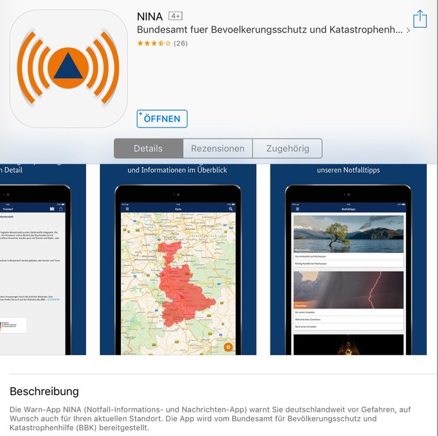 FW-E: NINA 2.0 ist da. Die Notfall-, Informations- und Nachrichtenapp (NINA) des Bundesamtes für Bevölkerungsschutz und Katastrophenhilfe ist in einer verbesserten Version verfügbar