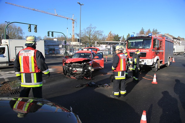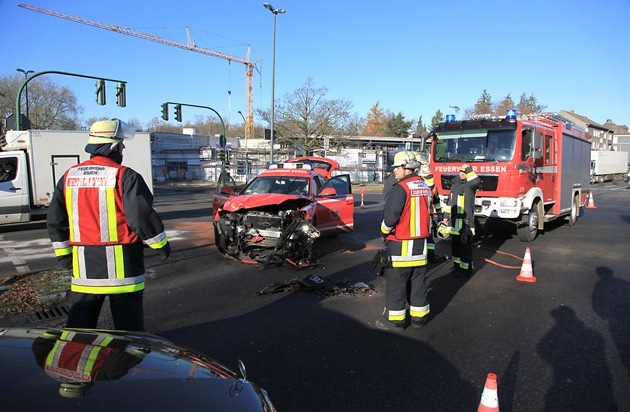 Am späten Vormittag ist ein Einsatzleitwagen (Audi Q5) der Feuerwehr Essen auf der Fahrt zu einem Einsatz in Essen-Heisingen verunglückt. In der Kreuzung Wuppertaler Straße/Frankenstraße kollidierte das Einsatzfahrzeug, welches zum Unfallzeitpunkt mit eingeschaltetem Blaulicht und Martinshorn unterwegs war, mit einem von der Frankenstraße kommenden Opel Astra. Die 63 Jahre alte Fahrerin des Opel Astra wurde leicht verletzt und nach rettungsdienstlicher Versorgung in ein Krankenhaus gebracht. Die beiden Feuerwehrleute (29 und 39 Jahre alt) managten zunächst die Unfallstelle, bevor auch sie zur Untersuchung in eine Klinik gebracht wurden. Nach einem Check sind beide bereits wieder entlassen. Durch das Unfallgeschehen kam es zu erheblichen Verkehrsstörungen im Umfeld. (MF)