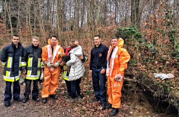 FW-E: "Angel" gerettet, Essener Feuerwehrleute befreien eine Norfolk-Terrier-Hündin, das Tier bleibt unversehrt, Besitzerin überglücklich