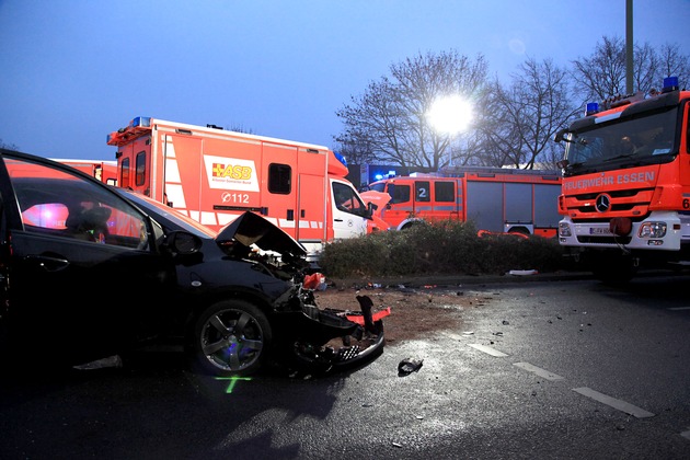 Bei einem Verkehrsunfall zwischen einem PKW und einem Rettungswagen (RTW) des Arbeiter-Samariter-Bundes (ASB) Essen sind am Nachmittag (23.01.2017) gegen 16.00 Uhr vier Menschen schwer verletzt worden. Der RTW war mit Blaulicht und Martinshorn auf einer Einsatzfahrt auf der Otto-Brenner-Straße in Richtung Borbeck unterwegs, ein Patient war nicht an Bord. Der PKW kam über die Borbecker Straße, im Kreuzungsbereich kollidierten die beiden Fahrzeuge im Frontbereich. Der 29-jährige Fahrer des PKW (Mazda 2) und seine 49-jährige Beifahrerin wurden beim Zusammenprall schwer verletzt, aber nicht eingeklemmt. Nach notärztlicher Versorgung erfolgte der Transport notarztbegleitet in ein Krankenhaus. Der Fahrer des Rettungswagens und sein Begleiter, der zunächst schonend aus dem verunfallten RTW befreit werden musste, wurden ebenfalls notärztlich versorgt. Erst dann konnte der Transport der Patienten in unterschiedliche Kliniken erfolgen. Die Ursache des schweren Unfalles ist noch nicht geklärt. Während des Einsatzes war die stark befahrene Kreuzung zum Teil gesperrt. Die Polizei sicherte die Unfallstelle ab und nahm die Ermittlungen zur Ursache auf. Es kam zu starken Behinderungen im Verkehr. (MF)