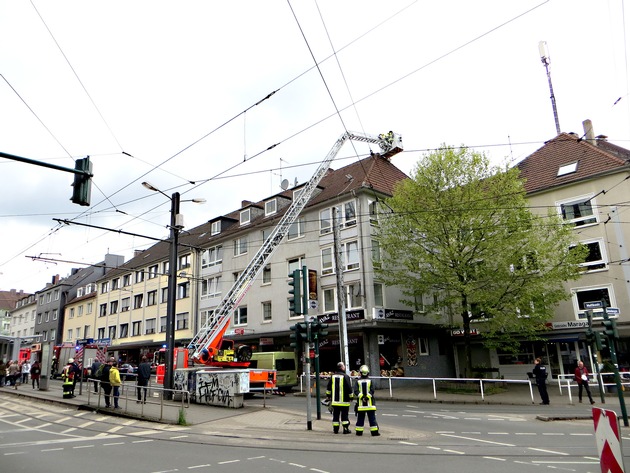 Die Rauchabzugsanlage eines Schnellimbisses an der Kreuzung Moltkestraße und Gutenbergstraße ist am Mittag (03.05.2017) aus unbekannter Ursache in Brand geraten. Passanten berichteten von Flammen, die aus der Öffnung des bis zum Giebel geführten Edelstahlrohres schlugen. Bei Eintreffen der Feuerwehr war nur eine intensive Rauchentwicklung zu erkennen. Mit mehreren Feuerlöschern brachten die Männer die Lage unter Kontrolle. Da der Elektrolüfter der Anlage in diesem Fall am Abzugskopf montiert war, kam die Drehleiter zum Einsatz. Die Männer demontierten dort lose Blechverkleidungen und nahmen sie mit hinunter. Wegen des Einsatzes der Drehleiter musste die Straßenbahnoberleitung abgeschaltet werden, die Linien 101, 105 und 106 waren unterbrochen, Busse kamen zum Einsatz. Verletzt wurde bei diesem Einsatz niemand. (MF)