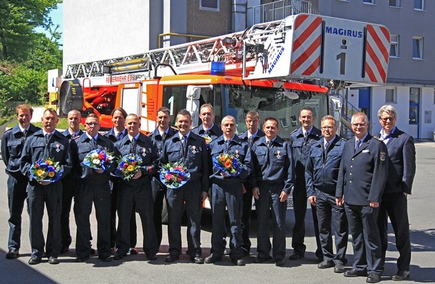 Feuerwehr-Dezernent Christian Kromberg hatte heute die Ehre, ein Dutzend Feuerwehrmänner für langjährige Dienste bei der Feuerwehr auszuzeichnen. In seiner Ansprache im Lage- und Logistikzentrum an der Eisernen Hand sagte er: "Ich bin immer wieder auf den Wachen unterwegs, da kommt man mit den Leuten ins Gespräch. Dabei habe ich noch niemanden kennengelernt, der es bereut hat, Feuerwehrmann geworden zu sein. Viele empfinden den Dienst immer noch als ehrenvoll und sinnstiftend im Sinne von "Ich mache das gerne, mit Leidenschaft und für die Bürgerinnen und Bürger unserer Stadt". Das zeichnet Sie aus, und dafür sage ich Danke. Danke im Namen unserer Bürgerinnen und Bürger, aber auch im Namen von Politik und Verwaltung. Wir sind alle stolz darauf, dass Sie hier in Essen Feuerwehrmänner sind und diese Aufgabe mit Leidenschaft, Augenmaß und manchmal auch Mut in dieser hohen Qualität erfüllen." Nach der Ansprache erfolgten die Übergabe der Urkunden und das Anstecken der Ehrenzeichen durch Branddirektor Jörg Wackerhahn. (MF)