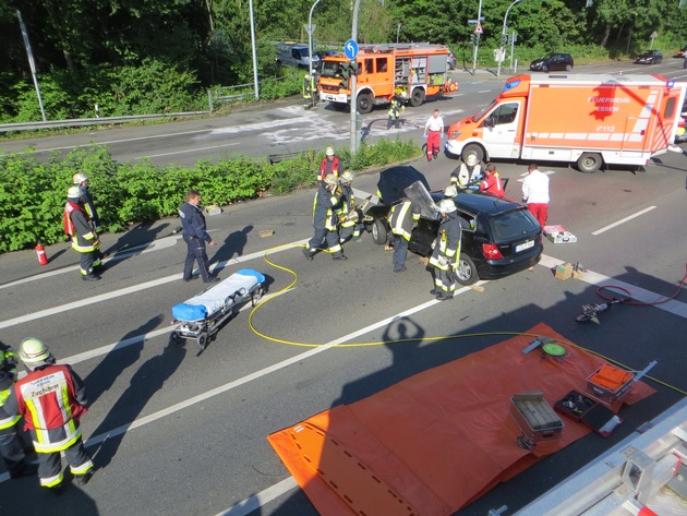 Zum zweiten Mal innerhalb von 24 Stunden rückten die Einsatzkräfte der Essener Feuerwehr zu einem schweren Verkehrsunfall aus. Der Unfall ereignete sich diesmal auf der Bottroper Str. im Kreuzungsbereich der Econova-Allee. Bei diesem Verkehrsunfall am Morgen wurde der Fahrer eines Honda Civic schwer verletzt. Der andere Unfallgegner, der Fahrer eines Autotransporters mit Anhänger, blieb unverletzt. Durch den Aufprall waren am Honda die Fahrertür und die B-Säule so stark beschädigt, dass der 57 Jahre alte Fahrer im Fahrzeug eingeklemmt war. Die Fahrertür wurde mit hydraulischem Rettungsgerät durch die Einsatzkräfte entfernt. Während der technischen Rettung wurde der Fahrer parallel durch das anwesende Rettungsdienstpersonal versorgt. Nach der patientenorientierten Rettung wurde der Verletzte in Begleitung eines Notarztes in ein zuständiges Krankenhaus transportiert. Die Straßen blieben im dortigen Kreuzungsbereich während der Rettungsarbeiten und für die anschließende Unfallaufnahme komplett gesperrt. Der Honda wurde nach der Rettung und der Unfallaufnahme, durch die Polizei, durch einen Abschleppdienst zur Sicherstellung transportiert. Die Unfallursache ist auch hier unklar, deshalb ermittelt die Polizei. (BW)