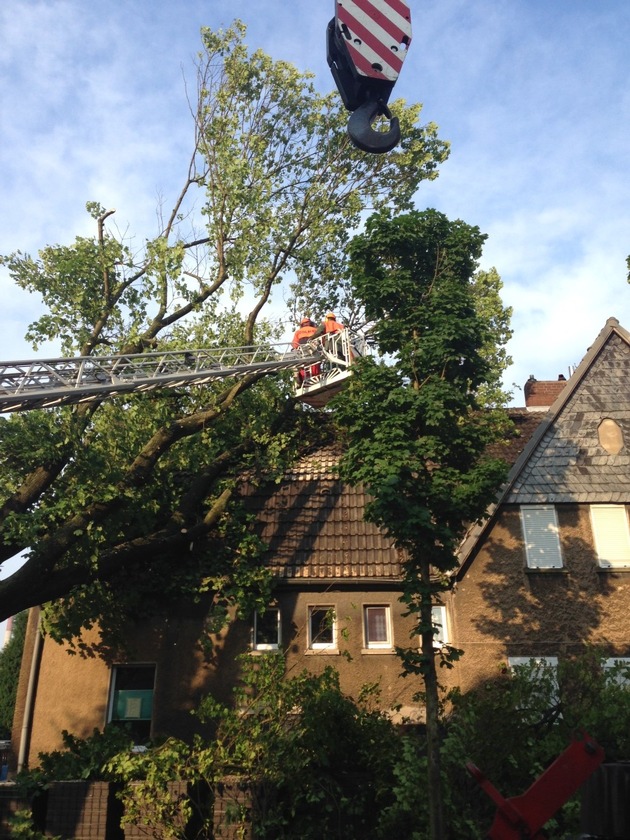 Nachdem am Donnerstagabend eine Unwetterfront mit Starkregen, Hagel, heftigen Windböen und schweren Gewittern über das Ruhrgebiet gezogen war, wurden auch die Feuerwehren zu verschiedenen Unwettereinsätzen alarmiert. Anders als in vergangenen Jahren, waren die Schäden im Essener Stadtgebiet eher gering, lediglich in Freisenbruch musste ein Ast auf einer Straße beseitigt werden. Anderes im Kreis Recklinghausen, hier stürzten mehrere Bäume auf Wohnhäuser, Autos und Straßen. Es kam zu erheblichen Schäden und Verkehrsbehinderungen. Die Essener Feuerwehr folgte einem Hilfeersuchen der Stadt Gladbeck und unterstütze mit mehreren Einsatzfahrzeugen, schwerem Gerät und 30 Einsatzkräften die Gladbecker Feuerwehr. Im Stadtteil Zweckel beseitigte die Essener Feuerwehr eine Reihe von umgestürzten Bäumen, die zum Teil in die Dächer angrenzender Häuser gestürzt waren. Obwohl sich den Einsatzkräften ein verheerendes Bild bot, kamen Menschen nicht zu Schaden. Die überörtliche Hilfeleistung dauerte bis in den frühen Morgenstunden. (JS, SK)