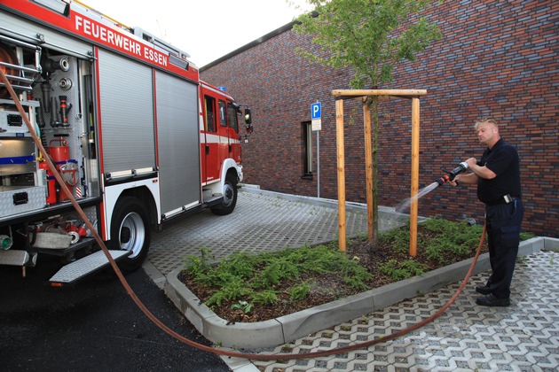 Der eine oder andere aufmerksame Essener wird sich vielleicht verdutzt die Augen reiben und zunächst nicht glauben wollen, was er da sieht. Keine Angst, es handelt sich um keine Fata Morgana oder um versteckte Bodenfeuer. Alle sechzehn Einheiten der Essener Freiwilligen Feuerwehr sind von heute Abend (21.06.2017) bis Sonntag einschließlich in den Stadtteilen unterwegs, um frisch angepflanzte Jungbäume mit dringend benötigtem Wasser zu versorgen. Grün und Gruga hat um Unterstützung gebeten, zu groß ist die Anzahl der frisch gesetzten Bäumchen. In den letzten Monaten ist wahrlich nicht viel Regen gefallen. Die Wetterprognose für die nächsten Tage lässt auch weiterhin nicht viel Niederschlag erwarten. Die hohen Temperaturen machen die Aktion letztlich erforderlich, um den jungen Bäumchen das Überleben zu sichern. Rolf Brochhagen-Hecke, Sprecher der Essener Freiwilligen Feuerwehren, der die einmalige Aktion organisiert, brachte es mit knappen Worten auf den Punkt: "Noch immer lässt uns der Pfingststurm 'Ela' nicht los. Erst hat er massenhaft Bäume umgeschmissen. Die Freiwilligen Feuerwehren und viele andere Helfer waren wochenlang mit Aufräumen beschäftigt. Jetzt müssen die Ersatzpflanzungen an den Straßen mit Wasser versorgt werden, damit sie nicht eingehen. Die ersten Bäumchen werfen bereits Laub ab". Pfingstmontag 2014 war das Sturmtief über Essen hinweg gezogen und hatte für chaotische Zustände gesorgt, Tausende Bäume an den Straßen, in Parks und Wäldern fielen 'Ela' zum Opfer. Aber nicht nur die Freiwillige Feuerwehr ist aufgerufen, Straßenbäume zu bewässern. Jeder Essener, dem etwas an unserer Grünen Hauptstadt liegt, darf gerne den durstigen Gesellen vor seiner Tür bewässern. Ideal sind 50 - 100 Liter täglich, zumindest so lange es so heiß ist. "Wasser marsch-für alle". Danke für Ihre Unterstützung. (MF)
