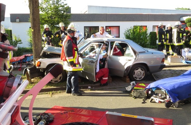 Um 18.58 Uhr rückten die Einsatzkräfte der Feuerwehr am Dienstagabend zu einem Verkehrsunfall zum Bonifaciusring in Essen-Kray aus. In dem dortigen Gewerbegebiet kam ein Mercedes-Benz aus bisher unbekannter Ursache von der Fahrbahn ab und prallte dort gegen einen Baum und wurde dadurch schwer beschädigt. Der 86 Jahre alte Fahrer und seine 79-jährige Begleiterin wurden bei dem Unfall schwer verletzt. An dem Unfall waren sonst keine weiteren Fahrzeuge beteiligt. Durch den Aufprall wurde die Limousine so stark beschädigt, dass der Fahrer und die Beifahrerin mit hydraulischem Rettungsgerät der Feuerwehr befreit werden mussten umso eine patientenschonende Rettung zu ermöglichen. Während der technischen Rettung wurden die beiden Insassen parallel durch das anwesende Rettungsdienstpersonal versorgt. Der Fahrer und die Beifahrerin wurden unter notärztlicher Behandlung in zuständige Krankenhäuser transportiert. Die Straße blieb während der Rettungsarbeiten und für die anschließende Unfallaufnahme für die Dauer von ca. zwei Stunden in beide Fahrtrichtungen gesperrt. Der Mercedes Benz Typ 190 E wurde nach der Rettung und der Unfallaufnahme durch einen Abschleppdienst zur Sicherstellung transportiert. Da die Unfallursache unklar war hat die Polizei die Ermittlungen diesbezüglich aufgenommen. (BW)