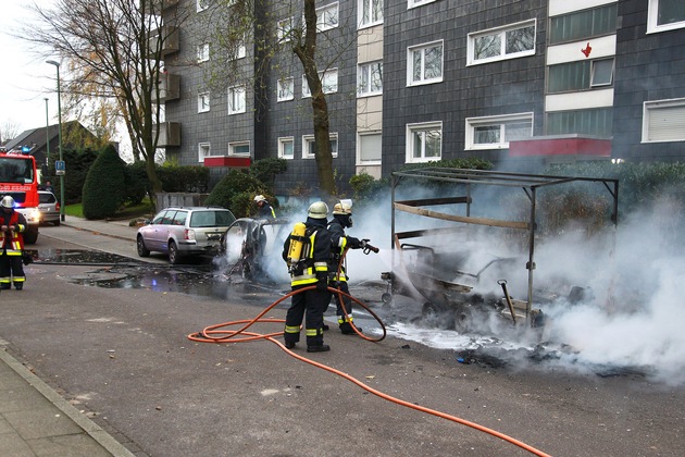 In Essen-Horst sind am Morgen ein an der Carl-Wolf-Straße abgestellter Smart und ein kleiner Planen-Anhänger mit Tandem-Achse vollständig ausgebrannt. Die Ladung des Anhängers bestand vermutlich unter anderem aus Hochdruckreinigern. Ein vor dem Smart geparkter Passat Variant wurde durch Strahlungswärme am Heck beschädigt, konnte aber von den Einsatzkräften geschützt werden. Die Rauchentwicklung in der dicht bebauten Wohnsiedlung war intensiv, glücklicherweise waren die Fenster der Wohnhäuser geschlossen. Zwei Trupps bekämpften den Brand mit zwei Strahlrohren, nach einer dreiviertel Stunde rückte das letzte Fahrzeug von der Einsatzstelle ab. Die Höhe des Schadens und die Brandursache sind unbekannt, die Kriminalpolizei ermittelt. (MF)
