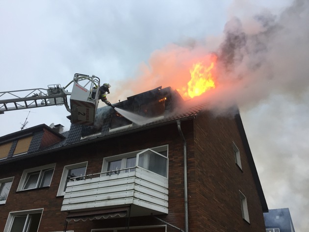 Gegen 09:15 Uhr meldeten mehrere Anrufer der Feuerwehrleitstelle einen Wohnungsbrand in einer Dachgeschosswohnung. Flammen seien schon sichtbar. Weitere Anrufer meldeten eine starke Verrauch und Brandgeruch im gesamten Stadtteil von Essen-Bochold. Beim Eintreffen der ersten Einsatzkräfte bestätigte sich der Wohnungsbrand in voller Ausdehnung in einem zweigeschossigen Mehrfamilienhaus mit ausgebautem Dachgeschoss. Der Brand in der Dachgeschosswohnung hatte sich zwischenzeitlich schon auf die Dachkonstruktion ausgebreitet. Die Bewohner wurden vor Eintreffen der Feuerwehr durch die Polizei in Sicherheit gebracht. Der Mieter der Wohnung hatte noch Löschversuche unternommen und sich dabei eine Rauchgasintoxikation zugezogen. Nach einer Untersuchung durch einen Notarzt konnte der Mieter vor Ort bleiben und musste keinem Krankenhaus zugeführt werden. Die Brandbekämpfung wurde über drei Drehleitern durchgeführt. Durch die massive Brandeinwirkung auf die Dachkonstruktion fielen beim Löschen brennende Verkleidungs-,Holzteile und Dachpfannen auf die Einsatzkräfte im Innenangriff. Da die Dachkonstruktion sichtbar an Tragfähigkeit verlor, wurde der Innenangriff beendet. Das Dach wurde über die Drehleitern abgedeckt und Brandherde von oben gelöscht. Ein vom Mieter als vermisst gemeldeter Hund wurde weder im Umkreis der Einsatzstelle noch im Bereich der Brandwohnung gefunden. Um die Stabilität des Daches zu beurteilen wurde ein Statiker des THW zur Einsatzstelle alarmiert. Das Ergebnis der Beurteilung steht noch aus. Wegen der massiven Rauchausbreitung wurde die Bevölkerung über die Warnapp NINA darüber informiert Türen und Fenster geschlossen zu halten. Mit einem Schadstoffmessfahrzeug wurden Messungen in den betroffenen Bereichen durchgeführt. Diese stellten keine für den Menschen gefährlichen Messwerte fest, sondern lediglich die gemeldete Geruchsbelästigung. Während der Löscharbeiten wurden die betroffenen Bewohner in einem Bus der Ruhrbahn untergebracht und durch einen Logistikzug der Feuerwehr verpflegt und betreut. Der Brand wurde mit 5 C-Rohren und 18 Atemschutzgeräten bekämpft. Die Feuerwehr war mit 2 Löschzügen, 2 Einsatzleitwagen, 2 Löschfahrzeugen der Kameraden der FF, 1 NEF, 1 RTW, 1 Atemschutzgerätewagen und einem Schadstoffmessfahrzeug vor Ort. Die Personalstärke vor Ort belief auf ca. 45 Einsatzkräfte. Die Nachlöscharbeiten dauert zur Zeit noch an und werden noch den ganzen Nachmittag in Anspruch nehmen.(OBR)