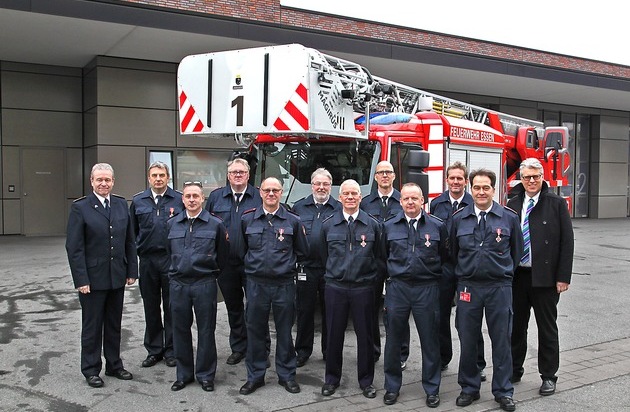 Feuerwehrdezernent Christian Kromberg hat heute (Dienstag 10.09.2017) zehn Mitarbeiter der Essener Feuerwehr geehrt. Im Rahmen einer kleinen Feierstunde überreichte er an Hans-Jörg Gurba, Marcus Patzen und Peter Marzoll Urkunden zum 25-jährigen Dienstjubiläum. Georg Gooßens bekam das Feuerwehr-Ehrenzeichen in Silber für 25 Jahre Dienst bei der Feuerwehr. Peter Bachmann, Volker Dammers, Wiglef Frühling, Thomas Gilles, Günter Schramm und Uwe Schabio nahmen das Feuerwehr-Ehrenzeichen in Gold für 35 Jahre bei der Feuerwehr entgegen. "Sie alle, meine Herren, feiern heute ein Jubiläum. Ein Jubiläum, das zeigt, dass Sie seit vielen Jahren in hohem Maße mit der Feuerwehr verbunden sind. Es ist eine gute Tradition, dass man diesen Menschen, die ihren Dienst an den Bürgern unserer Stadt mit viel Empathie und Fürsorge geleistet haben, von der Landesregierung, aber auch von unserem Oberbürgermeister ein ganz herzliches Dankeschön, verbunden mit den herzlichsten Glückwünschen, überbringt". (MF)