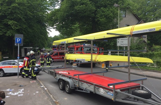 Am 11.05.2018 wurde die Feuerwehr Essen um 14:26 Uhr zu einem Verkehrsunfall mit einer eingeklemmten Person alarmiert. Beim Eintreffen der ersten Einsatzkräfte wurde festgestellt, dass eine männliche Person auf der Strasse lag und zwischen den beiden Achsen eines Tandembootanhängers eingeklemmt war. Die Person war auf Höhe des Brustkorbs von der ersten Achse des Anhängers überrollt worden. Der ansprechbare Patient wurde durch den Rettungsdienst und den anwesenden Notarzt medizinisch versorgt. In Absprache mit dem Rettungsdienst wurde eine technische Rettung durch die Kräfte der Feuerwehr vorbereitet. Nach dem der Patient medizinisch stabilisiert war, wurde er unter Einsatz von Lufthebekissen unter dem Anhänger befreit. Zur weiteren Behandlung wurde der Patient ins Uniklinikum Essen transportiert. Die Einsatzkräfte wurden durch Kollegen der DLRG unterstützt die sich zufällig am Unfallort aufhielten. Die Feuerwehr war mit 26 Einsatzkräften vor Ort.(OBR)