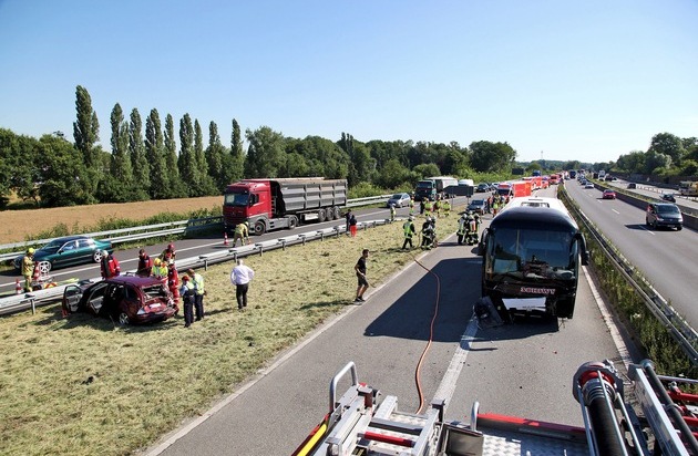FW-E: Verkehrsunfall auf der A 52, voll besetzter Reisebus und drei Pkw beteiligt, fünf Personen verletzt