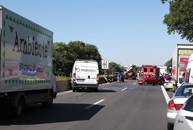 Auf der A 52 hat sich heute (28.06.2018) gegen 10.50 Uhr ein Verkehrsunfall mit drei Pkw und einem Citroen-Transporter (Sprinter-Klasse) ereignet. Durch ein früheres Unfallereignis hatte sich ein Rückstau auf der Autobahn gebildet. Darin kam es aus bislang ungeklärter Ursache zum Folgeunfall. In einem Kleinwagen (Fiat 500) wurden die beiden Insassen lebensgefährlich verletzt. Nach notärztlicher Versorgung wurden die zwei in ein Krankenhaus der Maximalversorgung gefahren. Ein Kia, besetzt mit einer 39 Jahre alten Frau und einem 36-jährigen Mann, wurde am Heck beschädigt, der Lieferwagen mit Frontschaden wurde von einem 24-jährigen gesteuert. Alle drei kamen ebenfalls in ein Krankenhaus. Mit leichten Blessuren kam ein Golf davon, dessen 39 Jahre alter Fahrer als einziger unverletzt aus dem Ereignis herauskam. Neben der rettungsdienstlichen Versorgung der Betroffenen mussten auslaufende Betriebsstoffe, Wasser, Öl und Kraftstoff, gebunden werden. Der Verkehr konnte einspurig über den Parkplatz Ickten an der Unfallstelle vorbeigeführt werden. Erwähnenswert ist die in diesem Fall vorbildliche Rettungsgasse, die ab AS Kettwig nur ein einziges Mal eingeengt wurde. (MF)