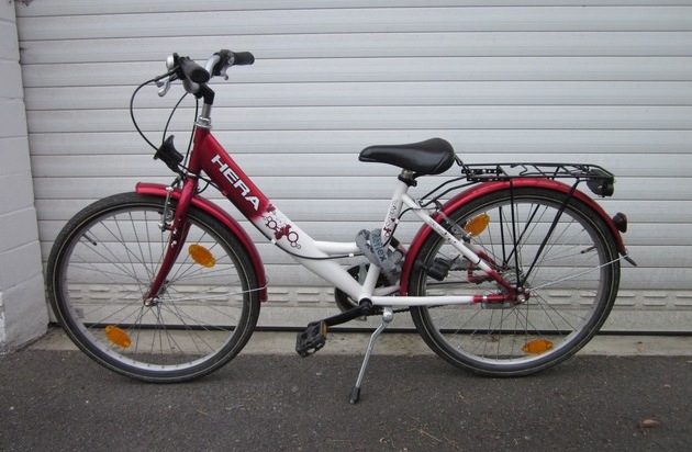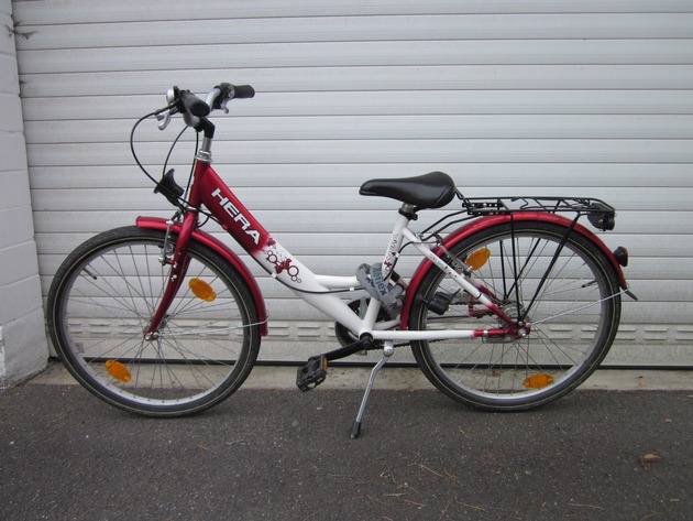 Am Sonntag, 12.06.2016 wurde in Banteln ein 24er Kinderfahrrad HERA (Mädchenrad) aufgefunden, welches in der Nacht von Samstag auf Sonntag dort abgestellt worden war. Die Rahmenfarbe ist rot-weiß, die Schutzbleche sind rot und das Fahrrad ist mit einer 3-Gang-Schaltung ausgestattet (siehe beigefügtes Bild). Zeugen, die Hinweise zur Herkunft des Fahrrades geben können, werden gebeten sich beim Polizeikommissariat Elze, Tel.: 05068-93030, zu melden.