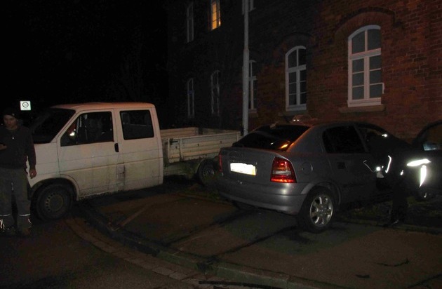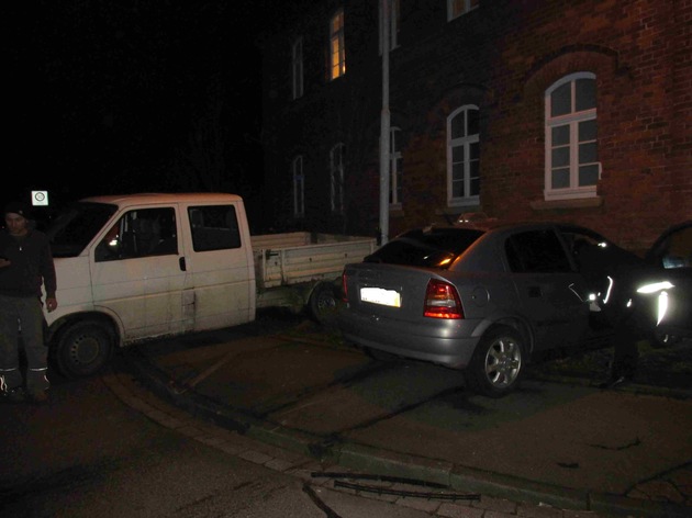 Glücklicherweise nur geringer Sachschaden entstand bei einem Verkehrsunfall in der letzten Nacht auf der Hamelner Straße in Bodenwerder. Was den Unfall für die Einsatzbeamten der Polizeistation Bodenwerder dennoch zu einem besonderen Fall macht, ist die Tatsache, dass Fahrer und Beifahrer nach der Verursachung zu Fuß geflüchtet sind. Gegen 01:00 Uhr in der Nacht zu heute befuhren zwei Personen mit einem Opel Astra die Hamelner Straße in Bodenwerder in Richtung Brökelner Straße. Im Einmündungsbereich der Elsa-Brandström-Straße wollte der Fahrer einen vor ihm langsam fahrenden VW-Pritschenwagen überholen, der seinerseits aber bereits zum Linksabbiegen angesetzt hatte. Dadurch stieß der Astrafahrer hinten links gegen die Hinterachse des Pritschenwagens. Beide Fahrzeuge wurden herumgeschleudert und landeten schließlich an einer Hauswand der Hamelner Straße. Beide Insassen des Opel flüchteten sofort nach dem Stillstand. Die eintreffenden Einsatzbeamten nahmen sofort die Fahndung auf und konnten einige Zeit später in der Wohnung der Halterin des Fahrzeugs zwei Personen feststellen, die verdächtigt werden, die Insassen gewesen zu sein. Da bisher beide Personen nicht gefahren sein wollen, wurden zur Feststellung der Fahrereigenschaft sowohl der PKW als auch die Oberbekleidung der Personen, die beide leicht alkoholisiert waren, sichergestellt. Es entstand ein Gesamtschaden von ca. 1.000,-- EUR. Personen wurden nicht verletzt.